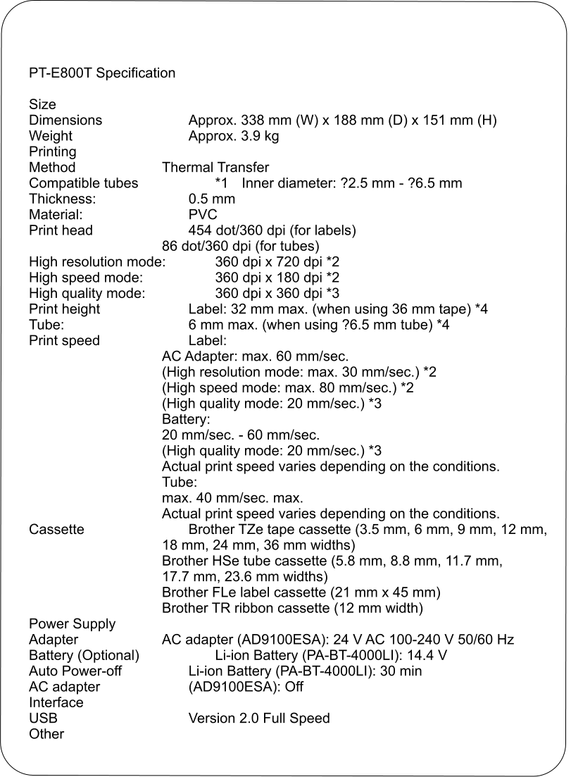 Next Previous Laminated Tape Label Printers  Product Galery Select Previous Next Brother P-Touch E-100VP PT E-100VP Brother P-Touch E-100VP Handheld 2 line Printer, 6-12mm Tape (Includes Case, 9 Volt Adapter Included). Brother P-Touch D600 PT-D600 Brother P-Touch D600 Desktop or workspace Colour display QWERTY 180dpi print resolution 30mm/s print speed   6, 9, 12, 18, 24mm Tape 24mm Black on White Tape (4m), AC Adapter, USB cable. Brother PT-E800T Industrial PT-E800T Brother PT-E800T Industrial Tube & Label Printer for Electrical Marking Desktop or workspace LCD display 360dpi print resolution 60mm/s max print speed Print hight 32mm Prints on tubes 2.5mm up to 6.5mm Prints on TZe laminated tapes up to 36mm wide Prints on HSe Heat Shrink Tube up to 17.7mm USB Professional Labelling Machine with USB & Wi-Fi Connectivity PT-E800W Standalone paper and fabric print & cutting machine CM-900 Brother SC-2000 StampCreator Pro SC-2000USB Brother PT-E800W Profetional Labeling Desktop or workspace LCD display Detachable QWERTY KBD 360dpi print resolution 60mm/s max print speed Print hight 32mm TZe tape cassettes: 6mm-36mm HSe heat-shrink tube: 5.8mm-23.6mm FLe die-cut labels: 45mm x 21mm size USB: Windows®(USB1.1, 2.0, 3.0 protocol) | Mac (USB 1.0, 2.0 protocol) Brother CM900 Paper & Fabric 12.3cm Colour touchscreen Large 12″ x 24″ scanning and cutting area 300dpi Built-in scanner Wireless network ready Cut most media up to 1.5mm thick Fabric cut SVG, PES and PHC data readability 11 Different stamp sizes Available in Red, Green, Blue and Black Over 150 preformatted designs Supports all truetype fonts Easy to use Micro raised image always give the same consistent image Real, durable rubber Smooth stamping operation Micro-porous control gives the same amount of ink transfer every time Compact and convenient Microsoft Windows / USB port Paper & Fabric Print & cut machines Stamp Creation Printer Labels, Ribbons, Label printers, Barcode readers, Mobile HHC’s, Wifi, Services and more